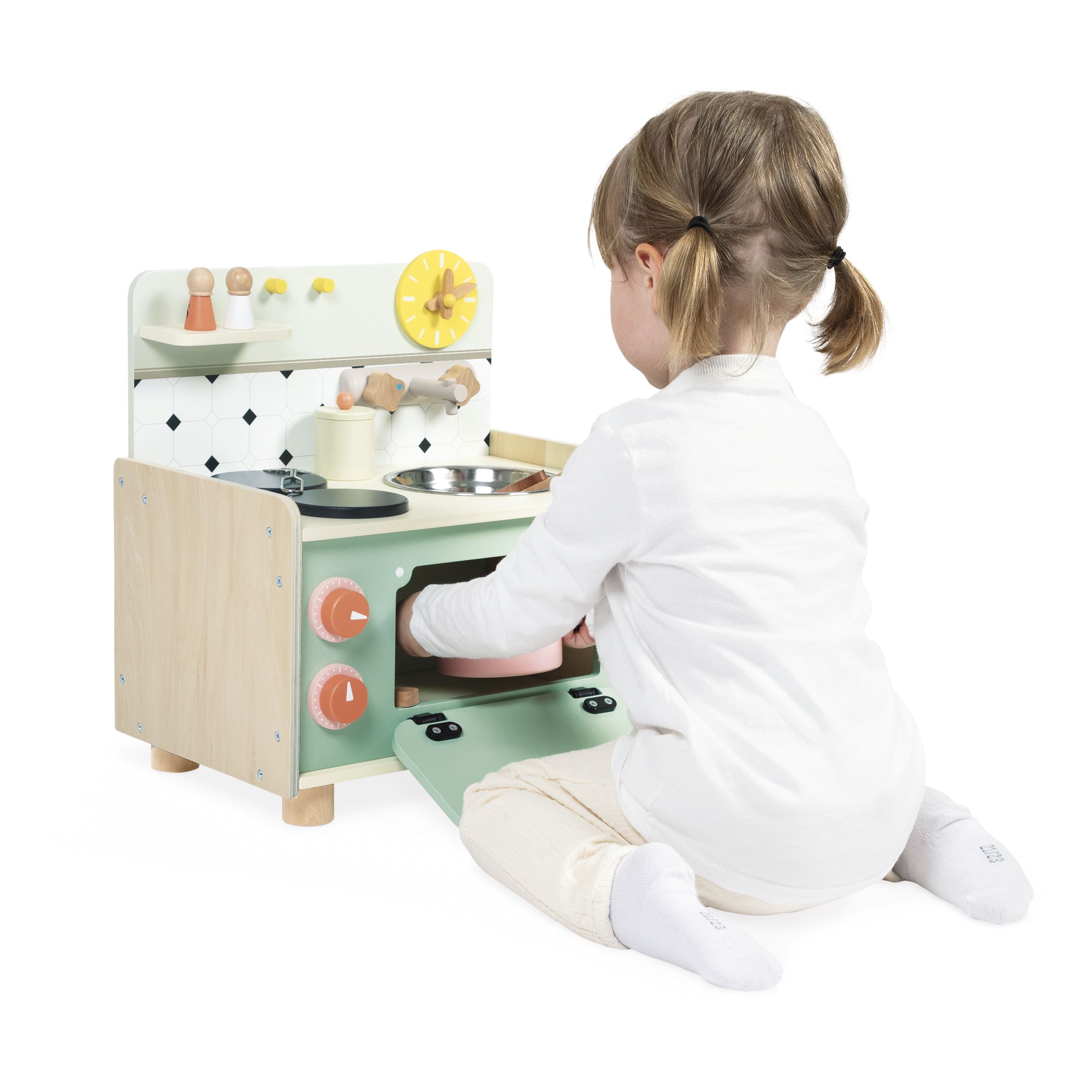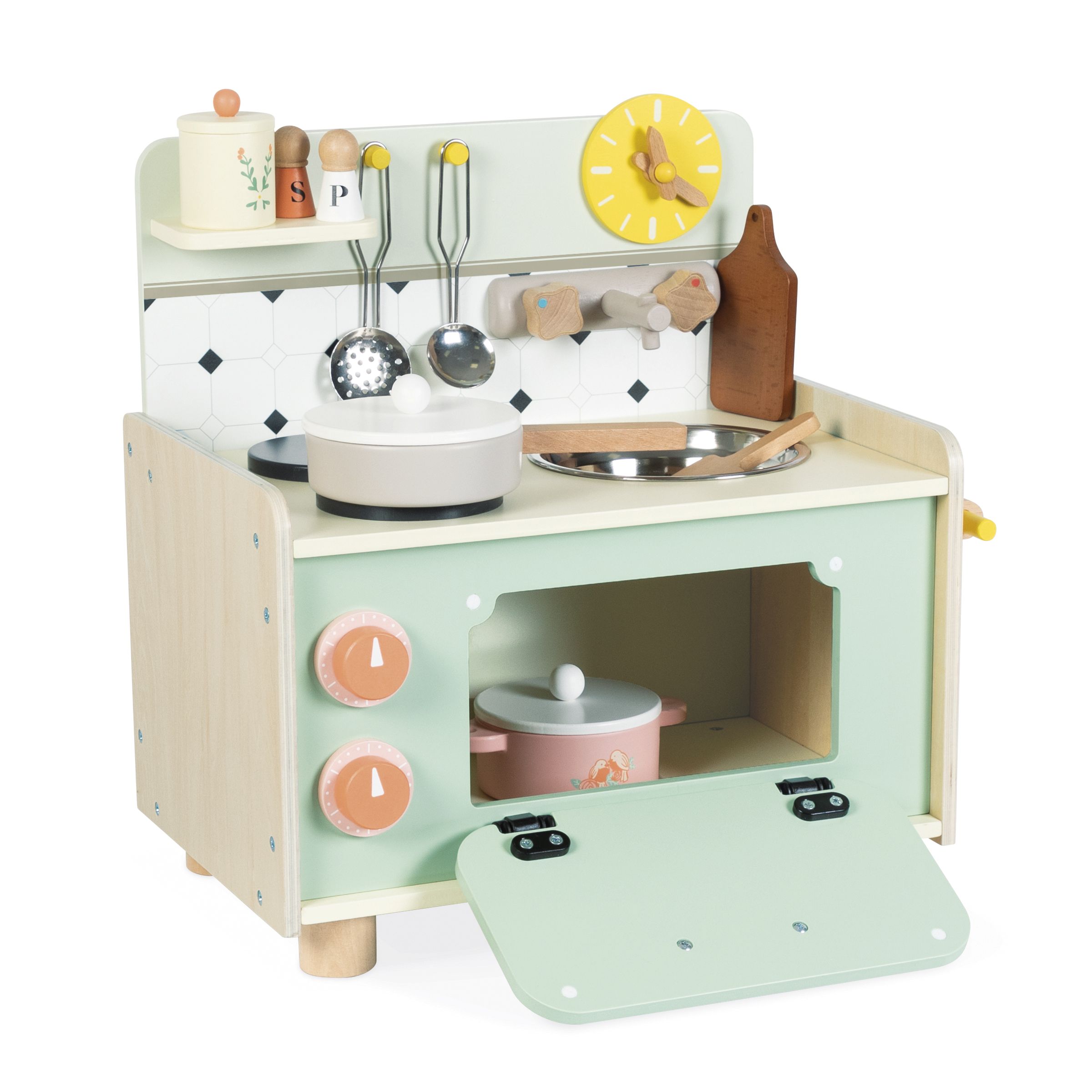 Hecho con materiales seguros y resistentes, esta cocinilla es ideal para fomentar el juego simbólico y la creatividad. ¡Una cocinita compacta, divertida y llena de posibilidades!
